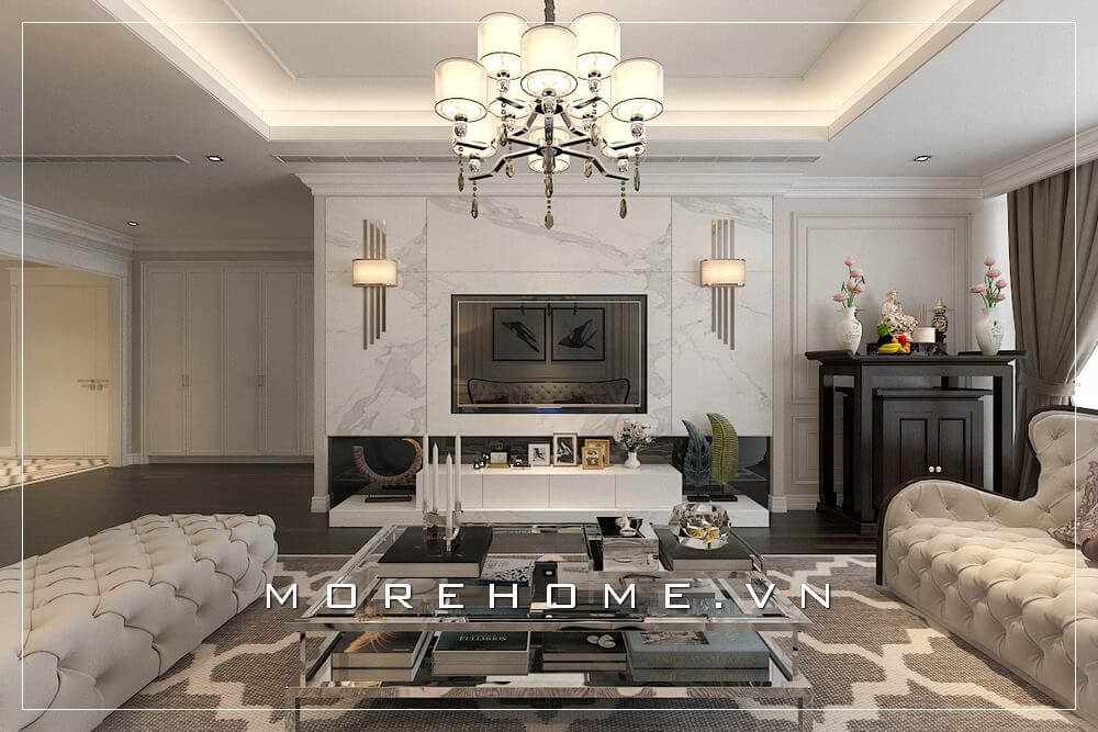 Trang trí nội thất phòng khách tân cổ điển sang trọng, đường nét hoa văn chạm khắc tinh tế tạo nên không gian căn phòng